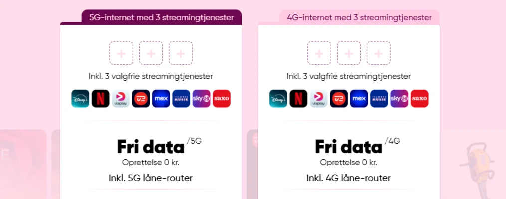 Som noget helt unikt kan Telmore også tilbyde internet med streamingtjenester. Det er smart, hvis du i forvejen abonnerer på streamingtjenester, da du hos Telmore kan spare penge ved at samle det i én pakke. Du skal dog mindst have 3 streamingtjenester, før det kan betale sig.